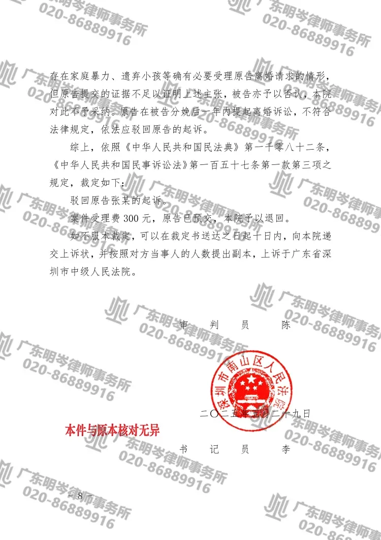 广东明岑律师代理女方驳回男方离婚请求 法院裁定男方起诉违反法定限制期限